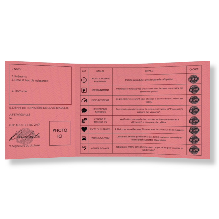 - 📜 Document Humoristique : Un permis fictif qui célèbre l'entrée dans la vie d'adulte avec une touche de légèreté et d'humour.