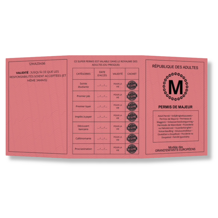 🎉 Bienvenue dans le monde des responsabilités, mais aussi des libertés et des petites victoires du quotidien ! Le Permis de Majeur est bien plus qu'un simple document : c'est le symbole de l'autonomie, des découvertes et de la joyeuse galère de devenir adulte. Idéal pour les jeunes adultes, les nouveaux diplômés, ou simplement pour ceux qui s'apprêtent à affronter le monde "réel" avec un sourire en coin. 😎✨
