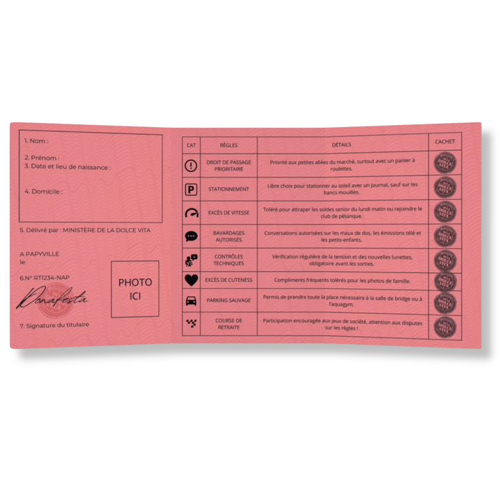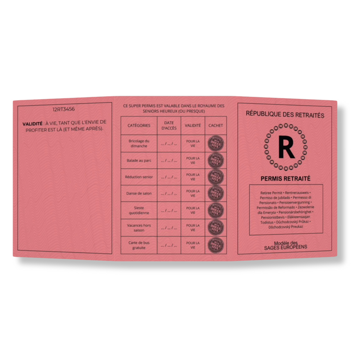🎉 Offrez bien plus qu'un simple cadeau : offrez une vie de privilèges, de sourires et de douceur avec le Permis Retraité ! Ce passeport pour la Dolce Vita est parfait pour les nouveaux retraités prêts à savourer chaque instant et à transformer leur retraite en une fête quotidienne. 😄